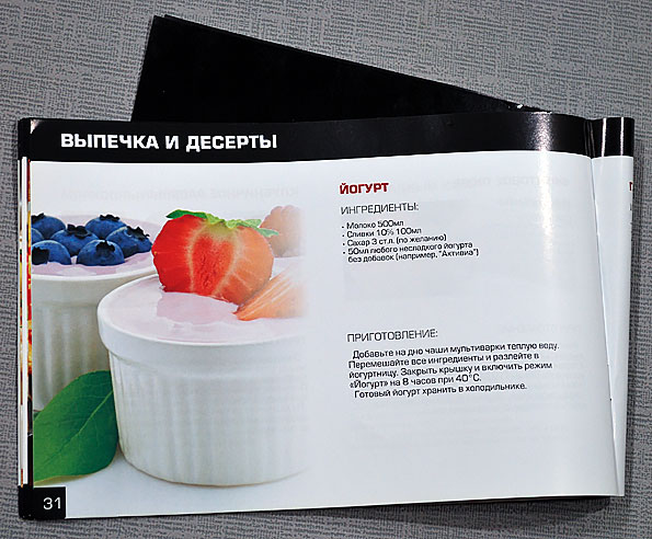 Как и с кашей — задача не для людей, любящих сложности. Самое непростое в рецепте — найти йогурт без сахара и добавок в качестве закваски. Хотя можно найти и саму закваску, это чуть усложнит работу. Вопросы у нас, тем не менее, возникли. Не указано, например, сколько надо лить воды на дно чаши. И отключается ли эта модель сама по прошествии восьми часов приготовления, ведь йогурт совсем не стоит передерживать. А мультиварка после окончания работы программы традиционно уходит в режим подогрева. Наша команда экспериментаторов трусливо запаслась будильником и самостоятельно прекратила процесс через означенное в рецепте время. Готовили мы йогурт на непастеризованном деревенском молоке.