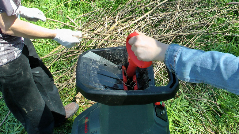 Работать нужно с умом и аккуратно, ежесекундно контролируя скорость и усилие подачи измельчаемого материала. Со временем начинаешь понимать, что ветки иногда нужно даже придерживать, чтобы они уходили в воронку не под силой тяжести, а дозированно. Ориентироваться приходится на слух, тут поможет только практика. В случаях, когда растопыренные концы ветвей застряли в воронке, их нужно затолкать в подающие ролики прилагаемой палкой-толкалкой.