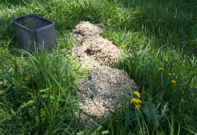 Куда бы ее теперь девать, эту стружку с мелкими веточками? Кто-то заполнит этим материалом компостную яму. И правильно сделает. Но правильно — не значит интересно. Мы вот обсыпали стружкой каменную ретро-клумбу, вокруг, по периметру.