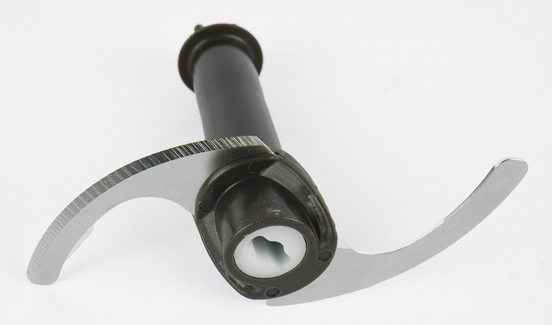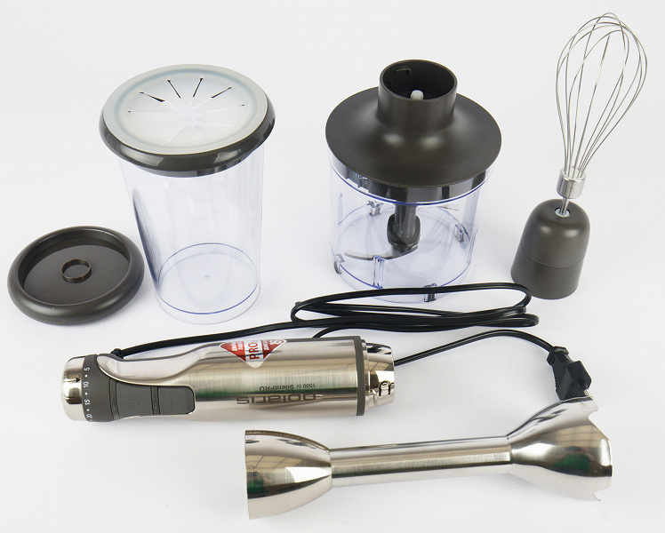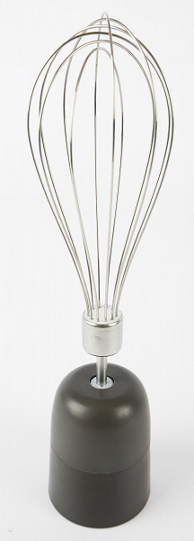 На электрическом шнуре, в месте его крепления к корпусу, расположена петля для подвешивания. Все три насадки (блендер, венчик и нож-измельчитель), сделаны из нержавеющей стали. Насадка-блендер при этом имеет титановое покрытие, благодаря которому, как обещает производитель, техника будет служить еще дольше.
