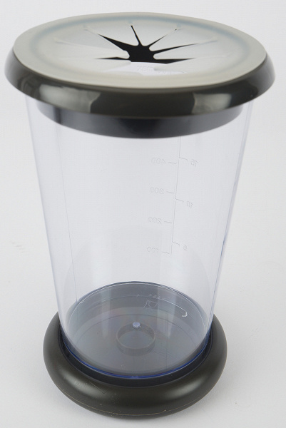 Стакан для смешивания изготовлен из не самого прочного пластика. По опыту, возможны царапины при эксплуатации, это обычная проблема многих погружных блендеров. На стенках стакана — риски, от 100 до 700 мл с шагом в 100 мл, и там же обозначения объема загруженного продукта в унциях (fl.oz).
