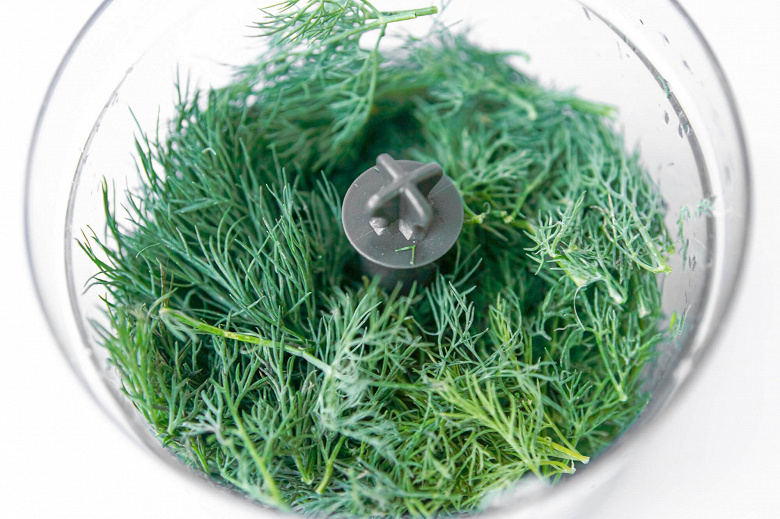 Предыдущий результат показал, что измельчитель довольно шустрый, и мы выбрали скорость поменьше, 10-ю. За 15 секунд нож измельчил не весь укроп, оставив небольшие веточки. Тогда мы вернули 15-ю и включили прибор еще на 10 секунд. Теперь перемололось все.