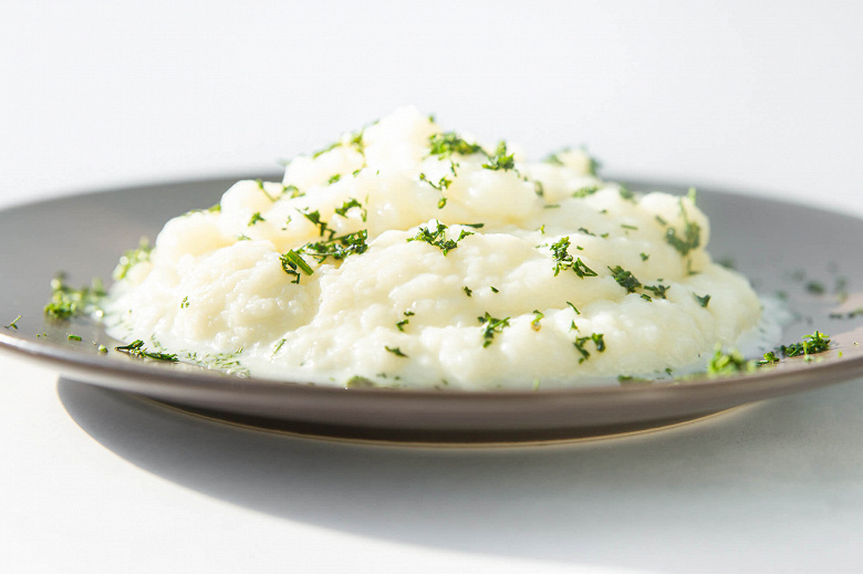 В кипящее подсоленное молоко, наполовину разбавленное водой, положили разрезанную на небольшие соцветия цветную капусту. На среднем огне варили ее до размягчения, около 20 минут, затем откинули на дуршлаг. Затем загрузили капусту в стакан для смешивания, туда же добавили размягченное сливочное масло и немного жидкости из кастрюли. С помощью насадки-блендера, привычными движениями вверх-вниз, за 30 секунд на 20-й скорости мы получили нежное, воздушное пюре без единого комочка.