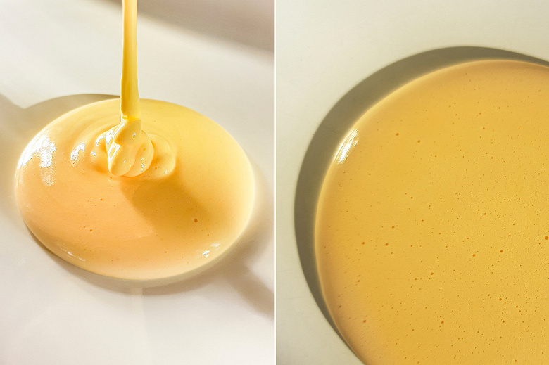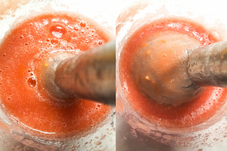 Мы продолжили измельчать томаты, выбрав режим «Turbo», еще 50 секунд. Результат — на фото ниже: слева — после 30 секунд, справа — после еще 20 секунд в режиме «Turbo». В пюре все еще встречались небольшие фрагменты не до конца перемолотой шкурки и косточек, но уже в гораздо меньшем количестве. В общей сложности за 1,5 минуты масса приобрела нужную однородность и воздушность.