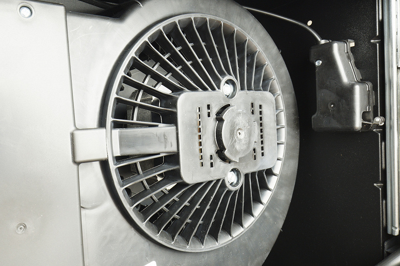 Устройство работает только в разложенном состоянии, поэтому внутренняя поверхность выдвижной части глухая. Внутри корпуса — два центробежных вентилятора.